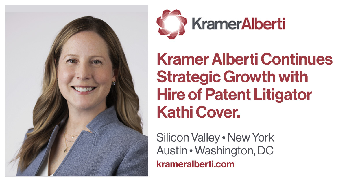 “I am thrilled to join the talented team at Kramer Alberti, and I look forward to contributing to the firm’s growing reputation as one of the best patent litigation firms in the nation,” said Ms. Cover.